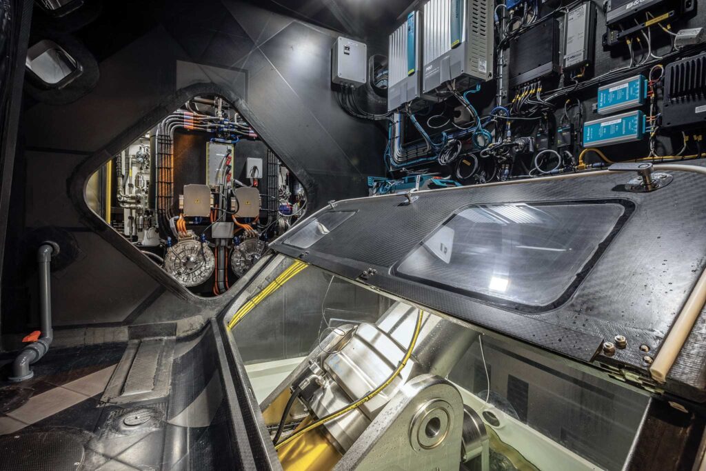 Sir Lindsay, a former motorsport driver, turned to the world of sports cars for ideas: “What do you do when every kilo counts? You ask the experts.” They partnered with Helix, a company that specializes in electric drivetrains produced for motorsports as well as Formula E and E1 Series powerboat racing. “There’s a lot in common [between motorsport and sailing]. When you’re driving either, it’s just you and the machine,” says Sir Lindsay. In fact, he cites car racing with priming him for the adrenaline of yacht racing starts.