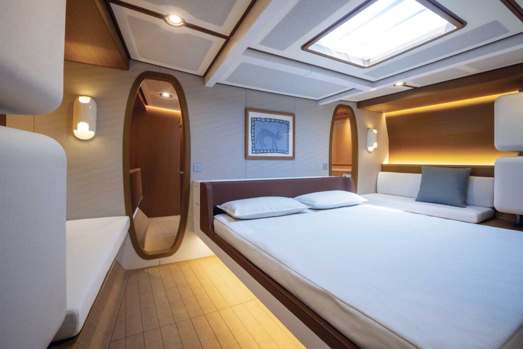 The twin rudders faced a similar dilemma. With a beam of over 23 feet, there was some calculus to be done to get rudders long enough to remain grippy when the boat is on its ear, while still shallow enough to fit into port. Verdier’s first instinct was kick-up rudders, which have become immensely popular on high octane racing yachts, but they would have had to be massive and would have ruined the lines of the transom. Instead, the team designed a retractable rudder in a rotating barrel housing that can be raised or lowered directly through the deck.