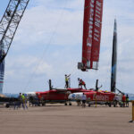 These data experts work out of shipping container offices that are strapped down and sent from destination to destination. Outside, a separate team assembles the boats with massive cranes. Each wing—they’re not quite sails, more like airplane wings—is in two parts. The bottom piece is always in use, and the top piece can be swapped out to make different rig sizes depending on the wind conditions expected that day. There’s certainly no jumping halyards on these boats; the race organization has a specialized team that manages, maintains, and assembles the wings.