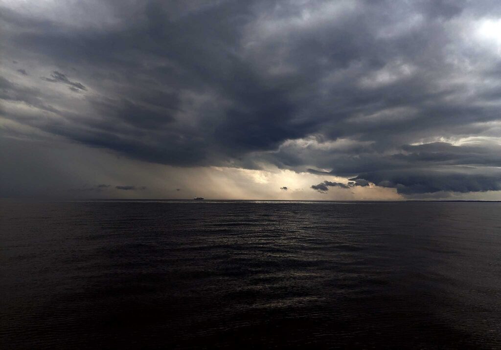 We finally saw a bit of wind that night, and with it an electrical storm in two parts, one east of us and one hovering over the shore to the west. The fleet threaded the needle neatly, though Brian, who’d been on a boat when it’d been struck by lightning before, suggested the helmsman wear gloves just in case. We tried not to think too hard about flesh melting to metal.