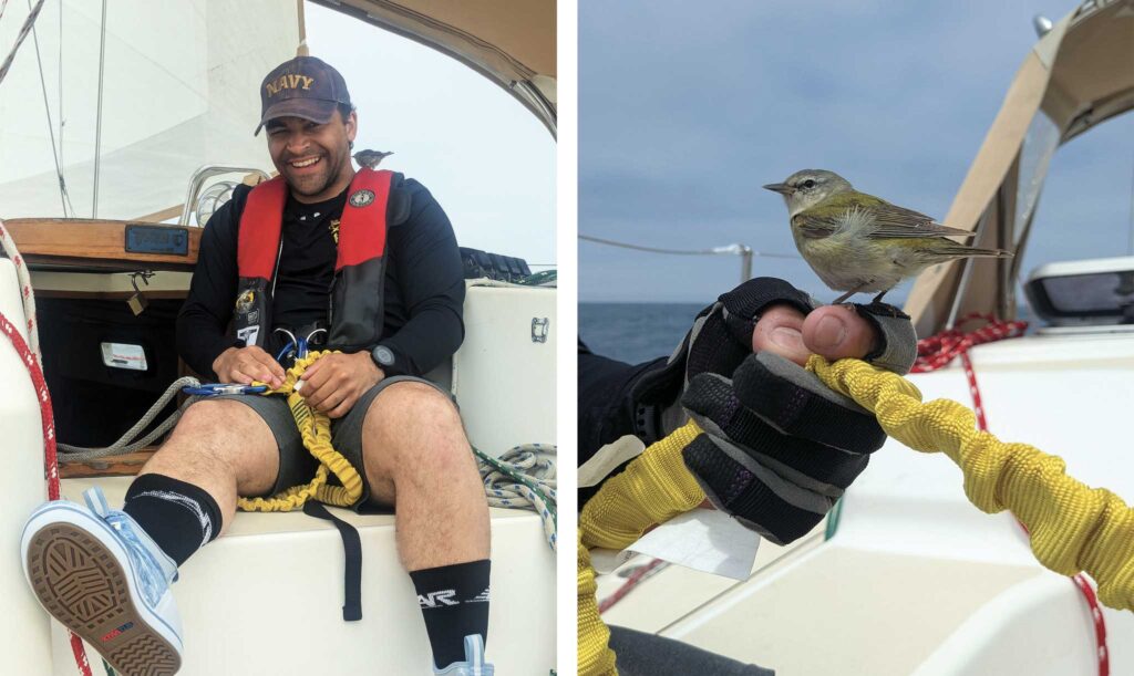 That afternoon a little yellow bird struggled to catch the boat, wet and exhausted. I coaxed him into the cockpit with my last orange slice and (after eating a truly astounding amount considering the size of his little body) he fluffed up to dry. A short nap later, and he was hopping about the boat, very happy to sit on our fingers and hair. He was curious and friendly, and he knew we meant him no harm. Eddie identified him as a Tennessee warbler, and we named him Tally.
