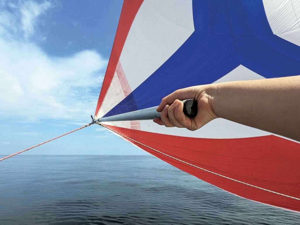 The next afternoon was long and hot. I amused myself for a while by using the boathook to poke the spinnaker away from the shrouds, occasionally getting it to fill for a few triumphant seconds. It was neither useful nor particularly entertaining, and I soon found myself back in the cockpit, reapplying sunscreen and recoiling everything I could reach.