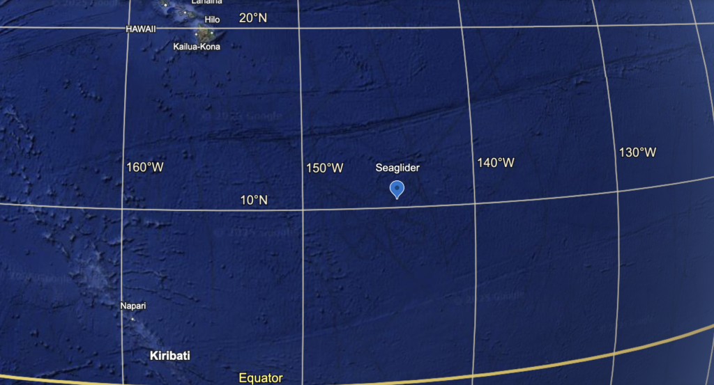 As of late last week (May 29), with its batteries running low, the glider had surfaced and was no longer able to continue its route. It was still pinging a position, which most recently was 10° 21.321′ North, 144° 38. 042 West, and it is expected to remain in that general area while moving around with currents.