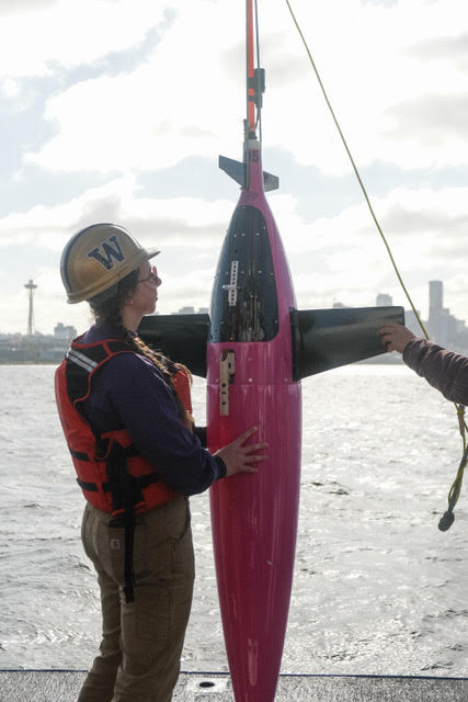 The Seaglider is one of a small fleet developed by the UW program, mostly by repairing “inherited” units and deploying them in Puget Sound. Designed to operate autonomously, the AUVs are programmed to travel and gather data without relying on physical human intervention. “Assisted by experienced mentors, students conduct technical testing, dive planning, and piloting. Through these activities, students gain invaluable experience conducting oceanographic research, develop essential skills and experience for future careers and make meaningful contributions to the field of oceanography,” the center’s website notes.