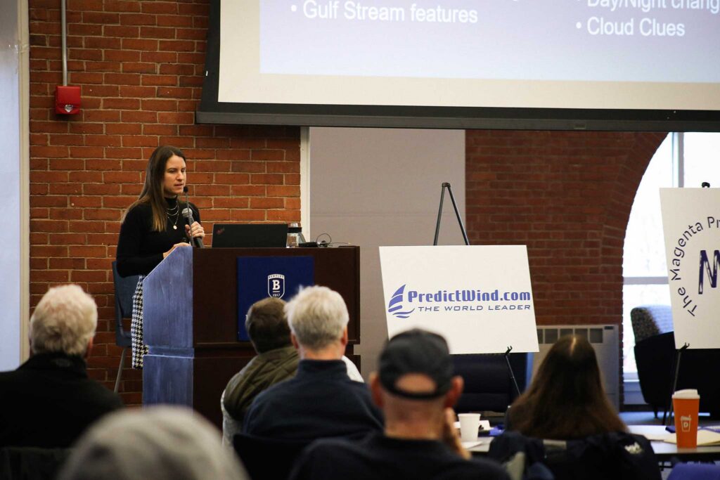 Then Chelsea Freas, founder of Sea Tactics, discussed weather patterns with a focus on the region that the Northeast offshore races cover, from large-scale climate patterns down to taking advantage of daily shifts. Freas is a degreed meteorologist who blends weather science and racing strategy to advise sailors, with clients ranging from Cole Brauer to the US Olympic program.