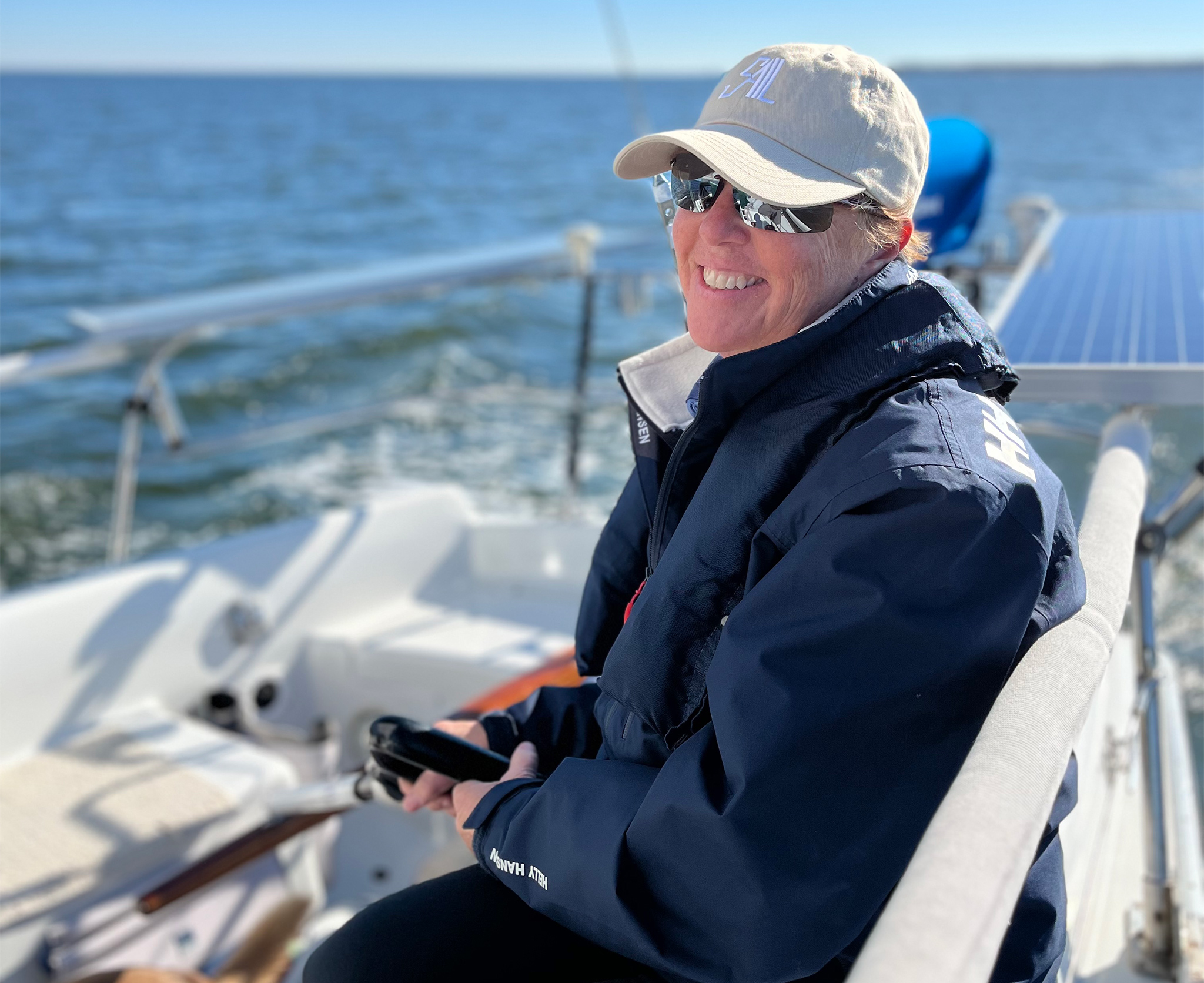 SAIL Editor-in-Chief Wendy Mitman Clarke enjoys a sunny autumn cruise in her Peterson 34 on the Chesapeake Bay. It was late afternoon just after the