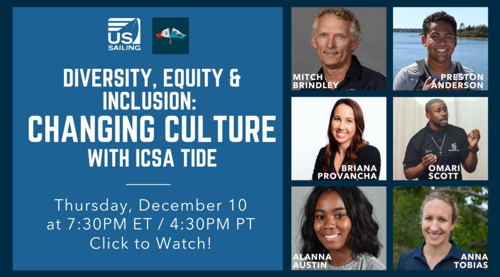 On Thursday, December 10, at 7:30EST, US Sailing’s Leadership Forum is hosting a town hall-style conversation with the Intercollegiate Sailing Association’s TIDE panel. TIDE (the Inclusivity, Diversity, and Equity) committees have been founded in three regional branches of the ISCA: New England, Mid-Atlantic, and South Atlantic. ISCA TIDE is currently working on education programs and a culture and demographic survey of collegiate sailing. The panel will feature Old Dominion sailing coach Mitch Brindley, Bowdoin’s Preston Anderson, Olympic sailor Briana Provancha, coach and former collegiate sailor Omari Scott, Tulane’s Alanna Austin, and Olympian gold medalist Anna Tobias.